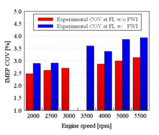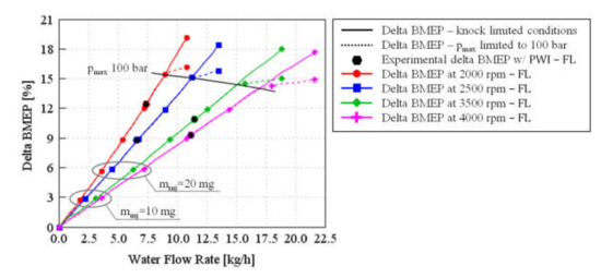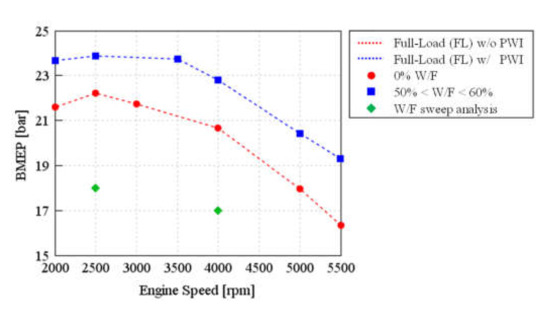 The calibration of the PWI model has been carried out considering the experimental outcomes obtained at the operating points of 2500 rpm–18 bar BMEP and 4000 rpm–17 bar BMEP, shown in Figure 2 with green rhombuses.