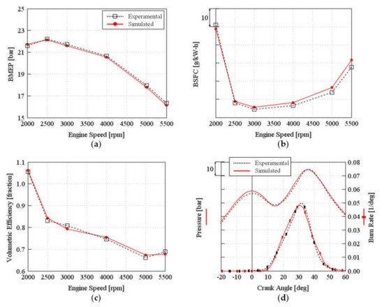 Six engine operating points at Full-Load, the ones shown with red circles in Figure 2, were chosen for the tuning of the four SITurb calibration parameters (see Section 3.1.1). By imposing the experimental spark timing, a Design of Experiment (DoE) methodology, integrated with a Genetic Algorithm optimum search, was used to identify the best set of SITurb constants aimed at minimizing the error between experimental and predicted burn rates for the selected operating conditions [44]. Once the optimal SITurb calibration parameters have been defined (see Table 2), the results of the complete engine model were compared with experimental data in order to assess its accuracy and reliability. The values of BMEP, BSFC and Volumetric Efficiency (referred to the air conditions in the intake manifold), depicted in Figure 3a–c, respectively, highlight a very good agreement with an error below 2%. Moreover, the simulated pressure cycle and burn rate profile reported in Figure 3d also show a satisfactory correlation with experimental measurements.