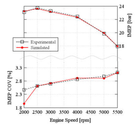 Coefficient of Variation of the Indicated Mean Effective Pressure (top) and average Indicated Mean Effective Pressure over 300 CCV-cycles (bottom) at Full-Load without Port Water Injection PWI; simulated (red solid line) and experimental (black dashed line).