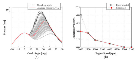 (a) Example of CCV simulation; (b) comparison between simulated (red solid line) and experimentally measured (black dashed line) knocking cycles percentage over 300 CCV-cycles at Full-Load without PWI.