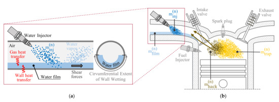 A particular model capable of reproducing the formation of a water wall film was adopted for the intake ports downstream of water injectors. Afterwards, with the aim of describing the roles that water performs during each cycle, Equation (8) was introduced: