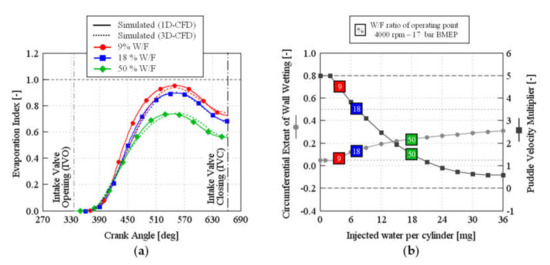 To carry out the calibration of the water wall film model, the results of a previous work of the authors were considered [30]: in particular, the Evaporation Indexes computed for three different values of Water-to-Fuel ratios, namely 9%, 18% and 50%, at the operating point 4000 rpm–17 bar BMEP, were taken as reference. Such calculations showed that the higher the mass of water injected, the higher the fraction retained by the wall film. Moreover, as depicted in Figure 8a by dashed lines, none of the computed indexes reached the maximum value of one: indeed, they were recorded during the third cycle in a row of Port Water Injection and therefore during the building-up of the liquid film.