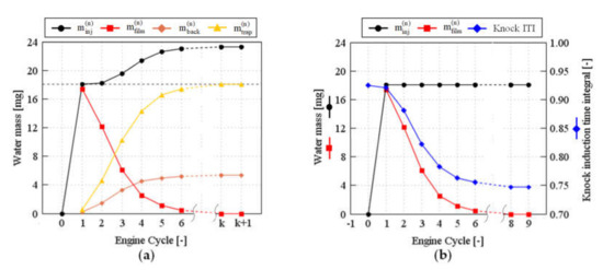 (a) The amount of water available before Intake Valve Opening (IVO), water trapped in the wall film, water backflow and water which is present into the cylinder during the combustion process as a function of the consecutive engine cycles with Port Water Injection (PWI); (b) The amount of injected water, trapped water in the wall film and the knock induction time integral as a function of the consecutive engine cycles with PWI; k ≥ 13 cycles.
