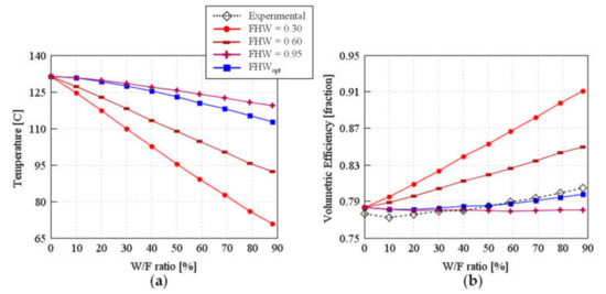 (a) In-cylinder temperature measured at Intake Valve Closing (IVC) and (b) Volumetric Efficiency as a function of the Water-to-Fuel ratio for different values of the Fraction of Vaporized Heat Taken from Walls (FHW) model calibration parameter; operating point 2500 rpm–18 bar.