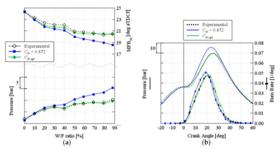 The robustness of Equation (11) was then assessed at the operating point 2500 rpm–18 bar BMEP: observing the green line of Figure 11a, the optimization led to MFB50 and maximum in-cylinder pressure values well correlated with the experimental results for the entire Water-to-Fuel ratio sweep, with errors lower than 2%. Moreover, also the simulated pressure cycle and the burn rate profile reported in Figure 11b for a 90% W/F show a satisfactory correlation with experimental measurements.