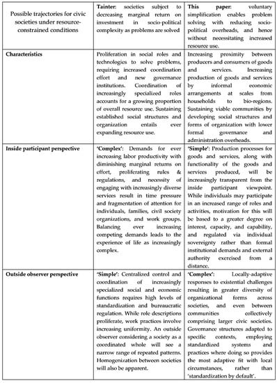 Under conditions where current levels of socio-political complexity cannot be extended or even maintained, acknowledging the systemic and cultural need for such controlled reduction is, we argue, far preferable to allowing collapse to unfold haphazardly and chaotically, but making this case requires a nuanced engagement with Tainter’s theory. For present purposes, we will treat voluntary simplification and economic deintensification as aspects of a general process leading to degrowth of formal economies and socio-political matrices, although to emphasize Tainter’s conceptual framework we will generally refer to this process via the term ‘voluntary simplification’. Defined further below, this refers to a process of planned contraction of a society’s energy and resource demands, with corresponding reductions in socio-political complexity [17,18].