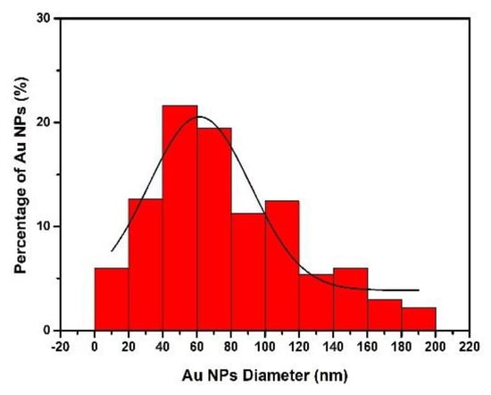 The chart was best fitted with a Gauss function, exhibiting a unimodal distribution of AuNPs. The highest percentage of NPs were found to be within 41–60 nm and 61–80 nm diameter size ranges, as it can be seen in