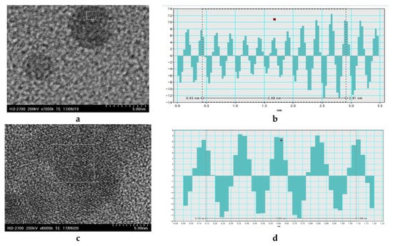 Figure 3a,c give information about the interplanar distance of the prepared sample. The interplanar distance marked in the first profile corresponds to the plane (111) face-centered cubic structure of gold nanoparticles, which is in good agreement with the XRD results shown below, in