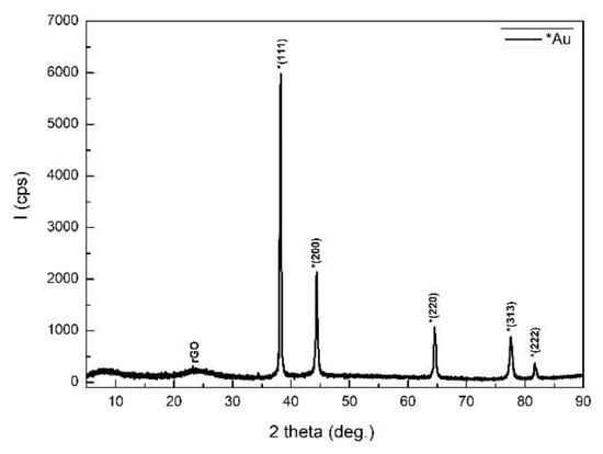 26]. The presence of Au is shown by the diffraction peaks at 38.18°, 44.39°, 64.58°, 77.55° and 81.72°, corresponding to the (111), (200), (220), (313) and (222) orientations, respectively, identified using PDF No 00-004-0784 [