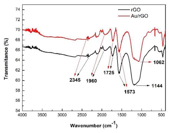 For the study of the presence of functional groups at the basal plane of the rGO after the reduction process, Fourier Transform Infrared spectroscopy (FTIR) measurements were acquired on both rGO and AuNPs/rGO, and the spectra are shown in