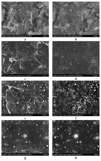Figure 6. The micrographs were achieved with two detectors: SE (a, c, e, g-left) which give information about the morphology of the sample and HA-BSE—high angle-backscattered electron (b, d, f, h-right) which has an emphasis on compositional information, at the same location on the sample at 3k×, 5k×, 20k× and 100k× magnifications.