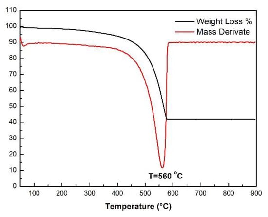 29], the slow weight loss, ~10%, observed in the interval 50–400 °C is caused, most likely, by the small amount of oxygen functional groups in the rGO’s structure. A sharp decrease in weight, ~50%, appears between 400° and 560 °C. As the derivate has only one peak, we can conclude that there is only one material that burns, namely, the rGO at 560 °C. The remnant mass is 41.71%, and it could represent the amount of Au, as the maximum heating temperature of the analysis (900 °C) is smaller than the melting point of gold, 1064 °C.