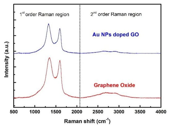 The micro-Raman spectra of both samples, rGO and AuNPs/rGO, show an intense and broad D band, reflecting the density of defects within materials’ structure which, most likely, are induced by the presence of oxygen-containing functional groups [