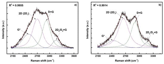 38], respectively. In a single layer of graphene, the 2D band appears as a single symmetric band, but in this case, due to the sample shape (multi-layered graphene stacks), this band splits into several modes. The splitting of this band is caused by the symmetry lowering, which occurs with the increase of the number of graphene layers. The band at 2922/2906 cm