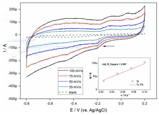 Figure 12 presents the CV curves acquired at different values of scan rate (25, 50, 75, 100 mV/s). Oxidative peak potentials and reductive peak potentials were well separated and very sensitive to the scan rate.