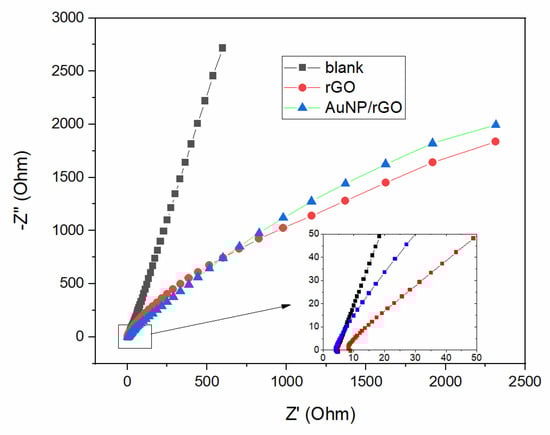Figure 13. The Nyquist plots were performed for blank electrode, rGO and AuNP/rGO; the obtained curves indicate a depressed semicircle for rGO and AuNP/rGO in the region of high frequency and a vertical line in the region of low frequency. The smaller semicircle in the case of AuNP/rGO suggests excellent electrical conductivity and a lower resistance value of the composite material.