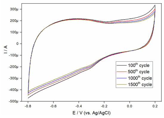 The stability of potential FC catalysts is an important target, thus, the prepared catalyst Au/rGO was exposed to an accelerated stress test, which consisted of 1500 potential cycles between −0.8 and +0.2 in 1 M KOH. The results are presented in the