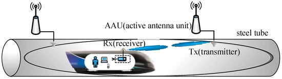 Hyperloop is a novel designed transportation method, which refers to a maglev train (vactrain) moving forward at near or supersonic speed (1000–4000 km/h) inside a vacuum metal tube []. The closed transportation scenario together with maglev technology can yield a new way of transportation with the merits of low mechanical friction, low air resistance, and low noise mode regardless of all weather conditions, not to mention the great conveniences to customers and quality promotion of rail services due to the ultra-high-velocity. As such, maintaining a dependable and reliable communication link is a pivotal issue to guarantee the safe operation of the Hyperloop and provide real-time multimedia information.