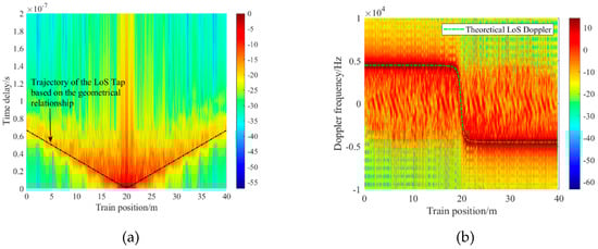 Figure 2a plots the emulated normalized channel impulse responses (CIRs) at different positions. The strongest received power appears when the Rx arrives at the middle of the tube, i.e., the shortest distance between Tx and Rx. In addition, the number of the effective taps increases as the Hyperloop approaches the ground antenna. The Doppler effect reflects the relative motion between Tx, Rx, and surroundings, which is extremely significant to the channel characterization for the Hyperloop. Figure 2b shows the Doppler power spectrum considering the LOS, single bounce, and double bounce components. Notably, the shape of the Doppler spectrum presents a feature of central symmetry with the symmetry point lies at the position of ground Tx. The main variation tendency of the LOS component is like as a Z shape with a turning angle close to 90°, whereas the tendency of the multipath component is like a S shape. In addition, their symmetry points vary along with the vactrain’s position. In summary, the severe Doppler effect using the DAS can lead to a drastic amplitude variation of the received signal.