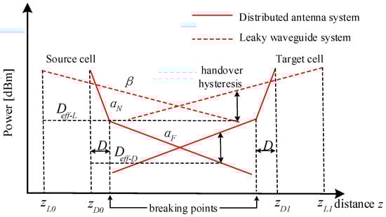 To our best knowledge, little research on the communication issue has been conducted, among which our team has performed a series of systematic works. In [], Qiu summarized the challenges as well as communication quality-of-service (QoS) quantitatively and proposed a leaky waveguide solution for wireless coverage. In [], we proposed two novel structures to reduce the Doppler effect using the distributed antenna system (DAS) method. In [], Han performed a series of work on the wireless channel analysis, including Doppler shift, power delay spectrum, and multi-input and multi-output (MIMO) capacity, in the vacuum tube scenarios based on the propagation-graph channel modelling theory. However, [] lacks a channel modelling-based simulation result, and [] neglects the large-scale characterization, especially in terms of the path loss. As such, we adopt the two-slope path loss model to depict its attenuation trend in this paper. Moreover, the radio coverage analysis of both DAS and leaky waveguide system (LWS) is performed and the corresponding handover judgment conditions are presented herein.