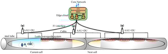 Figure 5 presents a diagram of the C-RAN for the Hyperloop. The nearby AAUs connect with the LWS via the cable and forward data to the edge cloud (or vice versa). The on-board terminals connect with the antennas embedded inside the train via WiFi technology, these antennas converge all terminals signal and forward them to the outside multi-input and multi-output (MIMO) antennas via cable or vice versa. This two-hop relay structure avoids a radio wave penetration attenuation of the vactrain body, guaranteeing a relatively stable received amplitude. The edge cloud can obtain a timely and accurate information of the train position based on the monitoring and detecting devices distributed along the tube line. As such, it can enable the approaching cell and disenable the passing one as the train proceeds forward. This is the basic idea of the moving cell scheme, which integrates several adjacent AAUs connecting to the same edge cloud into a logical cell to achieve a free-handover effect [].