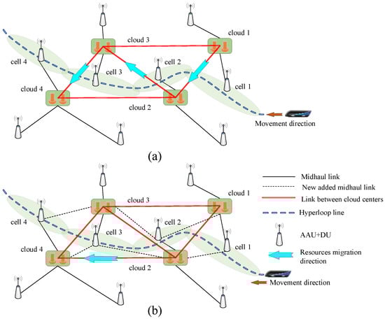 Figure 6 shows the diagram of the proposed network architecture, where Figure 6a is a schema of the conventional one-to-many mapping relationship and Figure 6b presents the many-to-many mapping relationship. Compared to Figure 6a, the many-to-many architecture enables a more flexible handover scheme. In addition, this flexible meshed architecture can yield a high safety robustness. For instance, if the link connecting cloud 1 to 3 suffers an interruption accidently, the Hyperloop can still maintain an uninterrupted connection via the link from cloud 1 to 2 and link from cloud 2 to 3.