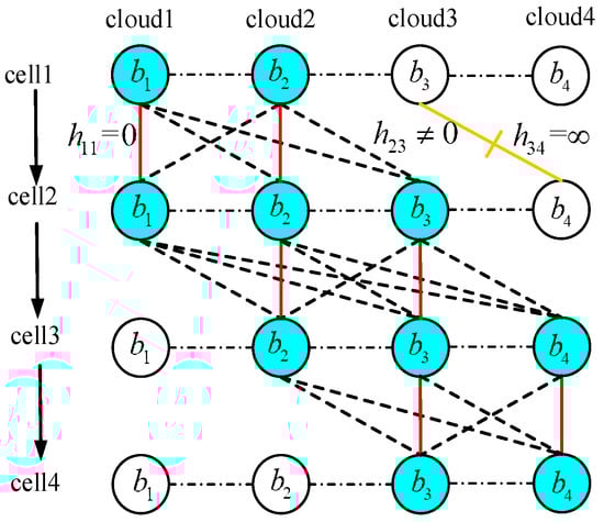 As shown in Figure 6, the Hyperloop proceeds across from cell 1 to 4 successively, involving 4 nearby edge clouds, i.e., cloud 1 to 4. Figure 7 presents an abstract graph of this topographical relationship. The vertical direction means the successive passing cells along the Hyperloop line, whereas the horizontal direction denotes cloud centers. Those vertexes with deep color in one row refer to those edge clouds that are connected to the same cell. The numbers marked inside each vertex circle denote the currently available computational capability of the edge cloud. As the Hyperloop travels across two cells belonging to two different edge clouds, a group handover occurs with a resource migration cost (e.g., the drop rate, BER, throughput, etc.). The cost between edge cloud c and c′ can be calculated as