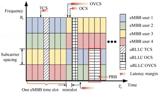 Given the fact that the 5G supports a flexible frame structure, each type of uRLLC traffic can be allocated to a PRB with specific bandwidth and time duration []. Specifically, a traffic with a stringent latency requirement is allocated to a PRB with small time duration but large bandwidth. To cope with the multi-types of uRLLC traffic for Hyperloop, we propose a novel latency-margin-based multiplexing scheme herein. In contrast to the conventional multiplexing scheme, multi-types of uRLLC traffic will be processed not at the next mini-slot directly. Instead, it is permitted to be allocated within its corresponding latency margin. For instance, two different types of uRLLC traffic arrive at the eighth mini-slot in Figure 8, the system ought to deal with OVCS traffic in no longer than next three mini-slots (latency margin: three mini-slots), whereas it would cope with the TCS and OCS traffic within next mini-slot (latency margin: one mini-slot). Obviously, the latency-margin-based idea enables great puncturing flexibility of PRB when multiplexing.