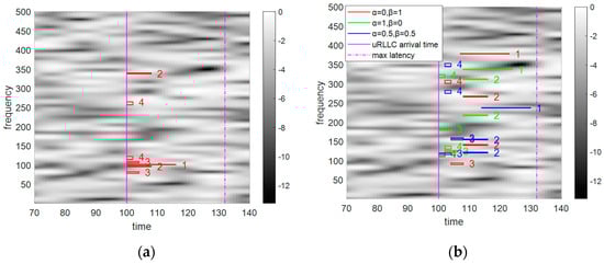 Figure 9 presents the simulation results of two multiplexing scheme. Figure 9a shows the PRB positions of different uRLLC traffic (1 for VS, 2 for PIS, 3 for OCS, and 4 for TCS) based on the conventional scheme, i.e., processing the arrived uRLLC traffic in the next mini-slot. In contrast, Figure 9b demonstrates our proposed scheme, where the background color implies the corresponding channel gain (white color refers to a high value). and are set at different value to investigate the primary between the throughput and uRLLC power. The first case focuses on the minimization of the uRLLC power and the corresponding PRB is allocated to time-frequency positions with a high value. The second case puts an emphasis on the minimization of the throughput. As such, the PRB is allocated to time-frequency positions with a low channel gain value. The third case takes both objections into account and yields a relatively compromise result.