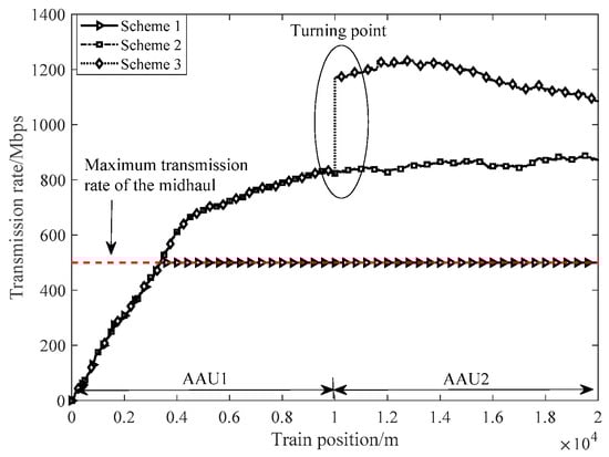 Figure 11 presents the simulation results of the pre-downloading scheme. The red line denotes the maximum transmission rate of the midhaul, whereas three schemes will be compared, i.e., Scheme 1: without cache, Scheme 2: conventional cache-based strategy (store some popular Internet content in the cache in advance), and Scheme 2: our proposal. The vactrain starts from AAU1 and proceeds across AAU2. The actual throughput of three schemes stays the same in AAU1. Notably, Scheme 3 enables the pre-downloading procedure as the midhaul turns congested. Then, in AAU2, an abrupt throughput ascent of Scheme 3 appears since it pre-downloads some requested contents to the cache. This cache-based scheme presents an inspiring throughput performance especially in terms of the congested wired link.