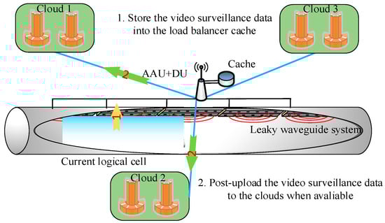 With regards to the passengers Internet resource management, the cache-based algorithm can yield not only a high throughput but also a low transmission latency [,]. Herein, we employ the cache in trackside active antenna unit (AAU) and formulate two resource management schemes by using the predictable vactrain trajectory, which can result in a higher throughput performance than the conventional cache-based scheme. Although the cache-based prefetching idea for the HSRs has been explained in our previous work [], we formulate another resource management scheme dedicated to the video surveillance data, i.e., post-uploading scheme.