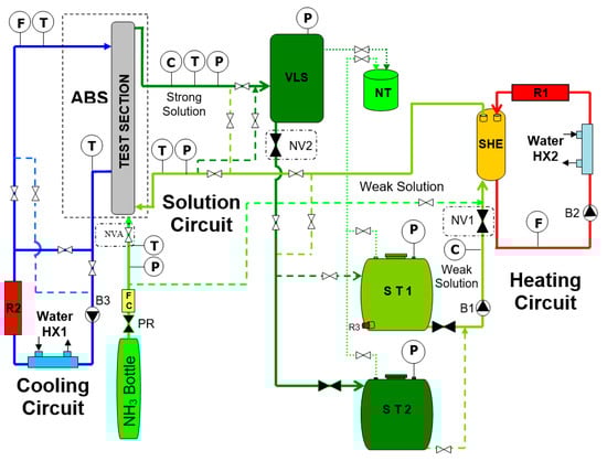 Figure 1 shows the experimental setup used to assess and correlate the ammonia vapor absorption in a plate heat exchanger. In this facility, measurable variables, such as inlet flows, inlet temperatures, inlet solution concentration in ammonia, and inlet solution pressure in the test section, can be monitored and controlled. The facility consists of 3 circuits: the NH3/LiNO3 mixture circuit, the heating circuit, and the heat dissipation/cooling circuit. In the NH3/LiNO3 mixture circuit, the solution (weak in refrigerant) is pumped (B1) from the storage tank 1 (ST1) to the heat exchanger (SHE) where it reaches the required solution temperature at the test section inlet. After the absorption process takes place in the test section, the solution (strong in refrigerant) leaves the test section to flow to a vapor–liquid separator (VLS) and finally to the storage tank 2 (ST2). The heating circuit includes a 5 kW heater (R1), a water–water heat exchanger (HX2), a pump (B2), and a magnetic flow meter (F). The heat dissipation/cooling circuit is used to dissipate the excess of heat released during the absorption process in the test section. This circuit includes a 5 kW heater (R2), a magnetic flow meter (F), a pump (B3), and a heat exchanger (HX1). The test section is also connected to an ammonia bottle which supplies the ammonia vapor at a pressure slightly higher than that in the absorber inlet.