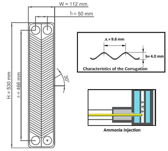The absorber used for this study was a plate heat exchanger (PHE) with four braze plates (three channels). The PHE is made of stainless steel AISI 316 and provided by Alfa Laval. It has Chevron-H type corrugations which correspond to an angle of 30° from the horizontal axis.