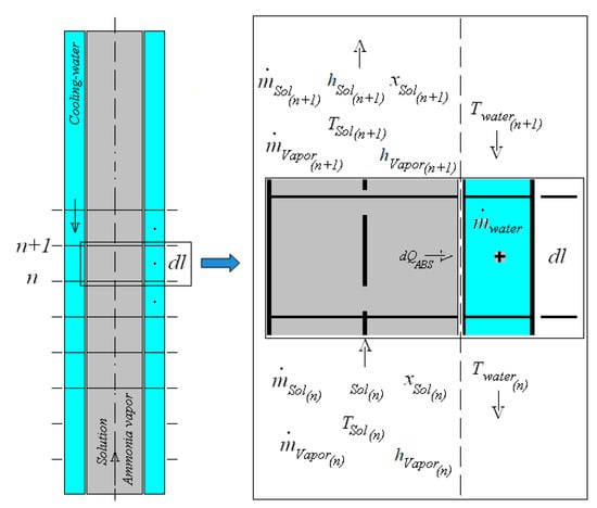 where is the differential mass transfer in each control volume, FAB is the NH3 absorption mass flux, and dTa is the differential transfer area. dTa is determined as dTa = 2·w·dl, where w is the width of the plate while dl is the control volume differential length. FAB is determined from Equation (5) where km is the mass transfer coefficient and LMXD is the logarithmic mean concentration difference. km is determined from Equation (6) where the ShSol is approached by Equation (16). In Equation (6), βSol is the diffusivity of the NH3/LiNO3 which is estimated as in [].