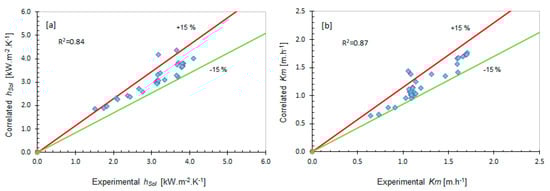 Figure 4b demonstrates that Equation (16) can adequately estimate 90% of the solution mass transfer coefficient points with relative differences below 15%. Moreover, Equation (17) can estimate 90% of the solution heat transfer coefficient data with relative differences below 15% (see Figure 4a). These correlations estimate the experimental data with average relative differences of 6.6% and 7.3%, for the heat and mass transfer coefficients, respectively. The fit parameter R2 for each correlation is shown in Figure 4. The correlations proposed in Equations (16) and (17) were developed for Reynolds numbers ranging from 10 to 55. In this study, the Prandtl number ranged between 46 and 51, and the Schmidt number in Equation (16) ranged from 5194 to 5947.