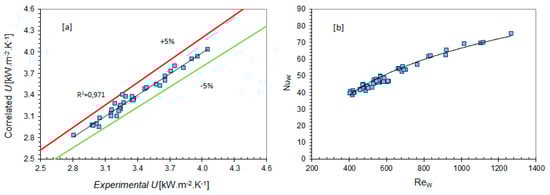 Figure 5a,b shows the overall heat transfer coefficient and water-side Nusselt number (NuCw) obtained from the experimental study in the H-type PHE using water in both channels in counter-current configuration and correlated in Equation (15). The black line represents the trend of the results. In these experiments, temperatures were changed in a range from 30 to 60 °C while the mass flow was varied from 50 to 352 kg·h−1. The correlation proposed in Equation (18) is recommended for a water turbulent flow with a Reynolds number ranging from 400 to 1400. The Prandtl number for the water flow ranged between 4.20 and 4.75. Figure 5a shows that Equation (18) can satisfactorily estimate 82.4% of the overall water heat transfer coefficient data with relative differences below 2% and an average relative difference of 1.17%.