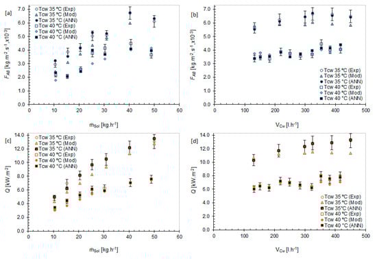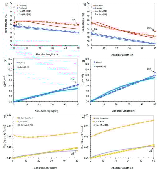 This subsection presents the estimation of the temperatures and concentration at the inlet and outlet of each partial control volume of the PHE using the semi-empirical model (Mod). Modelling of the plate absorber was performed at a mass flow of 40 kg·h−1 in the solution side. Inlet operating conditions were set as in Table 2. For comparison purposes, measured inlet and outlet conditions for temperature and solution concentration in the absorber are also depicted.