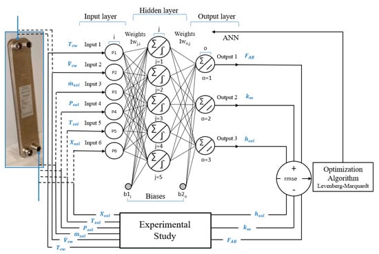 The neurons in the input and output layers correspond to the input and output parameters. The back-propagation method employing the Levenberg–Marquardt optimization algorithm was used to compare the experimental data feeding the network and the target output. Obtaining an accurate and solid ANN depends on the input parameters, the information available, and the method employed for training []. An experimental set of data was previously collected from the absorption process of ammonia vapor in an H-type plate absorber with NH3/LiNO3 [].