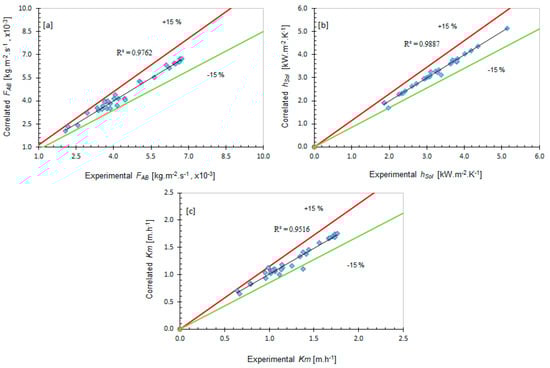Experimental data vs. correlated data obtained using the ANN model: (a) absorption mass flux; (b) solution heat transfer coefficient; and (c) solution mass transfer coefficient.