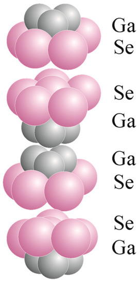 The supramolecular hierarchical structures GaSe(CS(NH2)2), GaSe(SmCl3) and GaSe(CS(NH2)2(SmCl3)) were synthesized by the intercalation method. The photosensible quasi two-dimensional semiconducting crystals of gallium selenide (GaSe), grown by the Bridgman–Stockbarger method, were used as the subhost crystal material. GaSe belongs to the n-type semiconductors, with the band gap of 2.02 eV [18]. It is characterized by a well-developed layered structure [17] and the affordability of guest positions within Van der Waals regions oriented perpendicularly to the crystallographic c-axis (Figure 1). Due to a weak interlayer bonding, the interlayer space can be enlarged multiple times by applying the intercalation method. Such an expanded GaSe lattice appears to be appropriate for the intercalation of guest atoms or molecules [19,20].