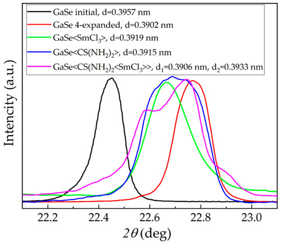 The XRD powder patterns of the initial GaSe matrix and intercalated hierarchical structures are given in Figure 5. XRD analysis reveals that the initial GaSe sample is of hexagonal structure [29], and the synthesized intercalates do not change it substantially. Some variations were observed in the XRD peak positions with the content of the hierarchical substances. The values of the corresponding interplanar distances were calculated based on the analysis of the angular positions of the relevant XRD peaks. The (004) peaks for intercalated samples are slightly shifted to the small-angle region compared to the expanded non-intercalated matrix (Figure 5). The profile of the XRD reflex of the GaSe(CS(NH2)2(SmCl3)) structure is characterized by two evident maxima, suggesting a coexistence of regions with slightly different interlayer distances.