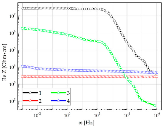 Frequency dependences of the real part of the complex impedance of non-intercalated 4-fold expanded GaSe matrix (1 black) and synthesized GaSe(CS(NH2)2) (2 red), GaSe(SmCl3) (3 green) and GaSe(CS(NH2)2(SmCl3)) (4 blue) structures measured along the crystallographic C axis.