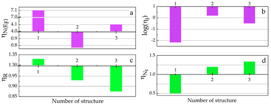 The intercalation of CS(NH2)2(SmCl3) into the GaSe lattice leads just to a slight increase in the ReZ value compared to the GaSe(CS(NH2)2) clathrate. Comparing, on the other hand, ReZ(ω)-dependences of the GaSe(CS(NH2)2(SmCl3)) and GaSe(SmCl3) clathrates, one may recognize their similarity only in the low-frequency region, roughly below 200 Hz. Hence, there is a non-additive influence of the subhost GaSe lattice, and the guest molecules in the frequency region related with a band carrier’s conductivity. It follows that there is a substantial influence of hierarchical modulating potential on the impurity electron spectrum, which provides current flow at room temperature. The density of states at the Fermi level N(EF), calculated with Pollak–Geballe theory [30] (see Figure 7), confirms the dominance of the impurity electron spectrum over the possible charge mobility growing perpendicularly to layers of the semiconductor. It is obvious that the actual density of deep trapping centres in the GaSe(CS(NH2)2(SmCl3)) is considerably higher compared to the associated influence of the guest CS(NH2)2 and SmCl3 molecules. At the same time, histograms explicitly indicate a decrease in the hopping radius of charge carriers caused by the influence of the hierarchy of complex clathrate barrier potential.