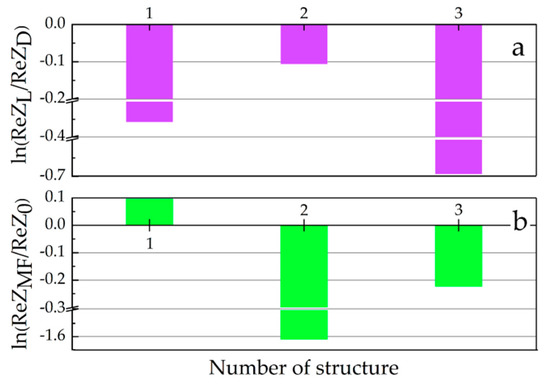 The intercalation of CS(NH2)2 into 4-fold expanded GaSe lattice leads to about 4-fold decrease in the real part of complex impedance ReZ of GaSe⟨CS(NH2)2⟩ supramolecular ensemble and it is evident from relevant frequency dependences ReZ(ω), which are demonstrated in Figure 6. The frequency independent part of ReZ(ω) is observable for the non-intercalated GaSe lattice in the 10−3−200 Hz frequency range. The GaSe(CS(NH2)2) supramolecular structure, however, reveals a stable ReZ magnitude in the entire frequency range.