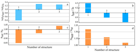 Histograms of change in the density of the states at the Fermi level N(EF) (a), trapping centres scattering J (b), and hopping radius R (c) and density of deep trapping centres Nt (d) in applied magnetic field for GaSe(SC(NH2)2) (1), GaSe(SmCl3) (2) and GaSe(SC(NH2)2(SmCl3)) (3).