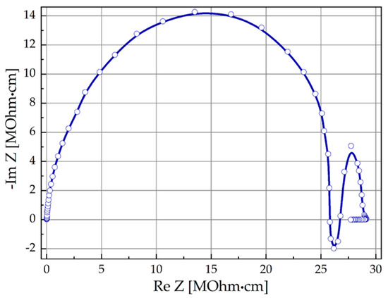 The Nyquist plot for complex impedance for the 4-fold expanded non-intercalated GaSe matrix (see Figure 10) demonstrates a classic two-arch shape. High-frequency and low-frequency arches represent current flow, in packages of unexpanded crystal lattice layers, and between them, respectively. The lowest frequency dispersion is also worth mentioning, because it reflects the quantum capacity [33] caused by the discretization of the energy spectrum perpendicularly to the layers.