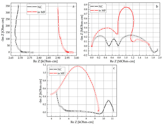 Nyquist plots for the synthesised hybrid structures GaSe(SC(NH2)2) (a), GaSe(SmCl3) (b) and GaSe(SC(NH2)2(SmCl3)) (c) measured under normal conditions (black) and under applied magnetic field (red).
