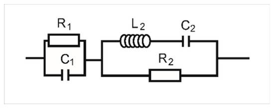 Intercalation of the subhost GaSe lattice by the guest CS(NH2)2, SmCl3 or CS(NH2)2(SmCl3) components changes the character of the complex impedance substantially (Figure 11). In the case of GaSe(SmCl3), the strong inductive response was observed in the low-frequency region. Such inductive response, however, disappeared in an applied external magnetic field. This phenomenon, known as negative capacitance [34,35], was studied intensively in a number of works [17,25,36], basically due to the potential related nanoelectronic applications—particularly, with the development of gyrator-free nanodelay lines. The equivalent electric circuit for the relevant low-frequency region of the Nyquist plot is presented in Figure 12. Using the complex amplitude method, such a circuit can be represented by analytical expression