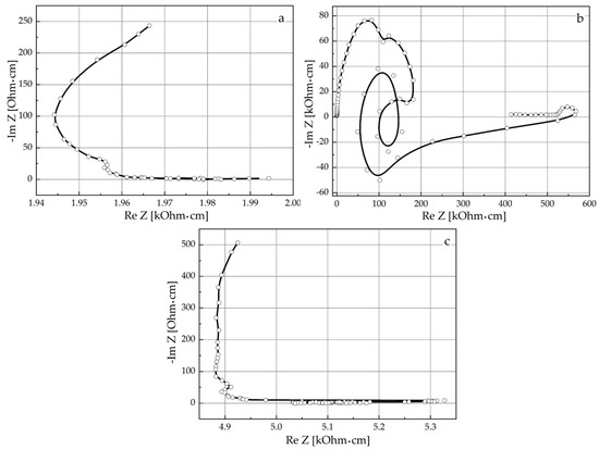 Nyquist plots for the synthesised hybrid structures GaSe(SC(NH2)2) (a), GaSe(SmCl3) (b) and GaSe(SC(NH2)2(SmCl3)) (c) measured perpendicularly to layers under illumination.