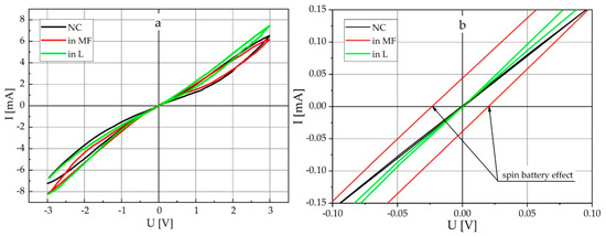 Current-voltage (CV) characteristics of GaSe(SC(NH2)2(SmCl3)) measured perpendicularly to the layers under normal conditions (black), in the applied magnetic field (red) and under light illumination (green) (a). Spin battery effect: experiment under normal conditions (black), in the magnetic field H = 2.75 kOe (red) and under light illumination (green) (b).